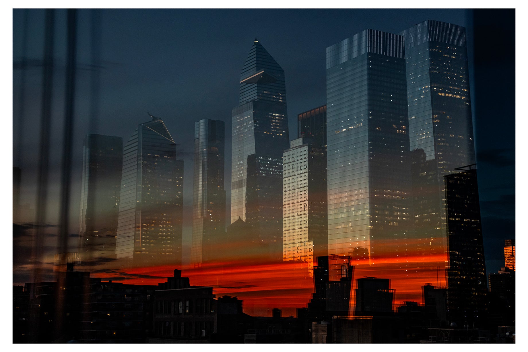 I took this photos of Hudson Yards from - and through - a window in Chelsea, Manhattan, with the sunset clouds reflecting in that same window, which sits in a 90 degree angle between my camera and Hudson Yards. There is no trick, this is an 'in-camera' photo, one shot as I saw it.