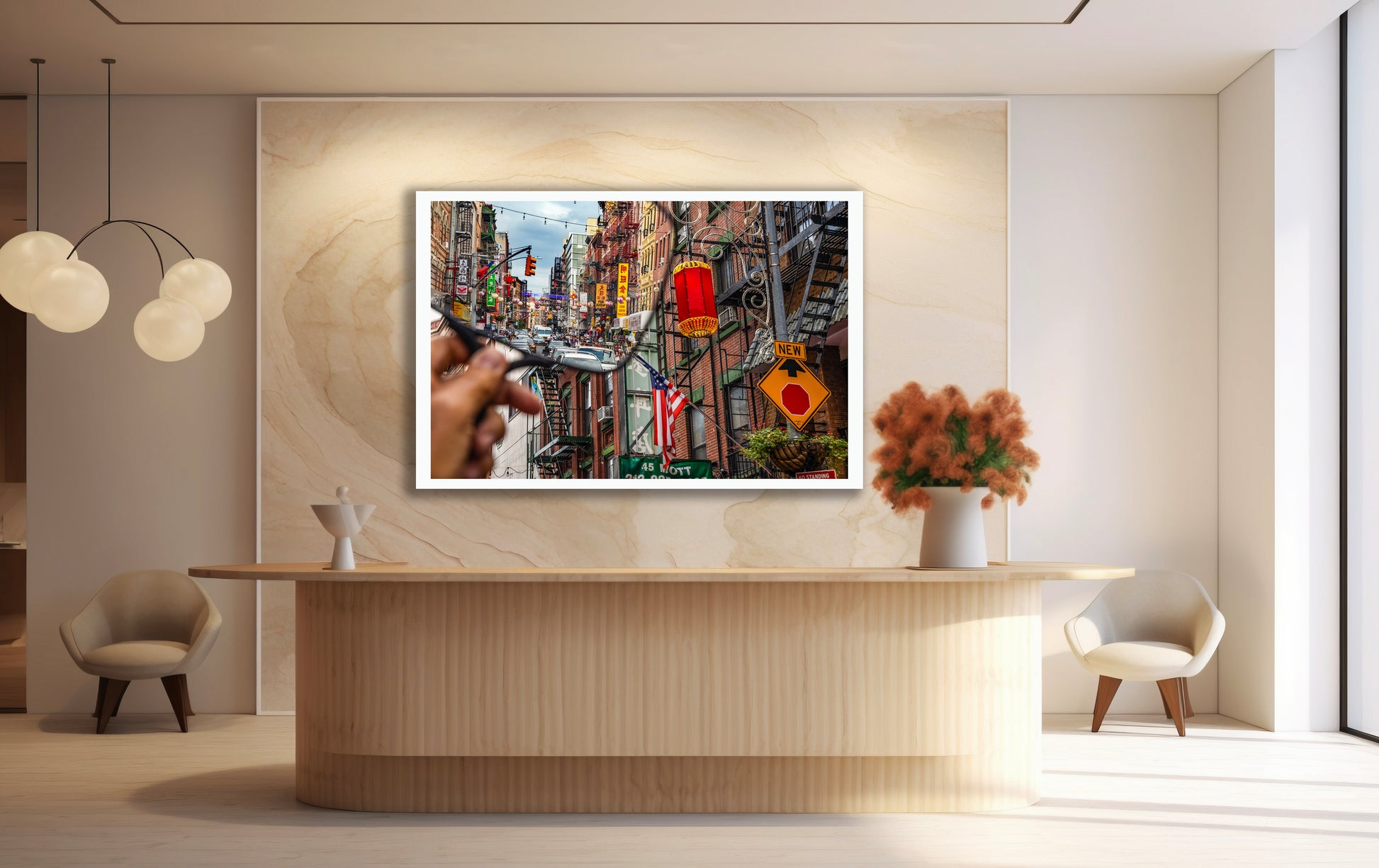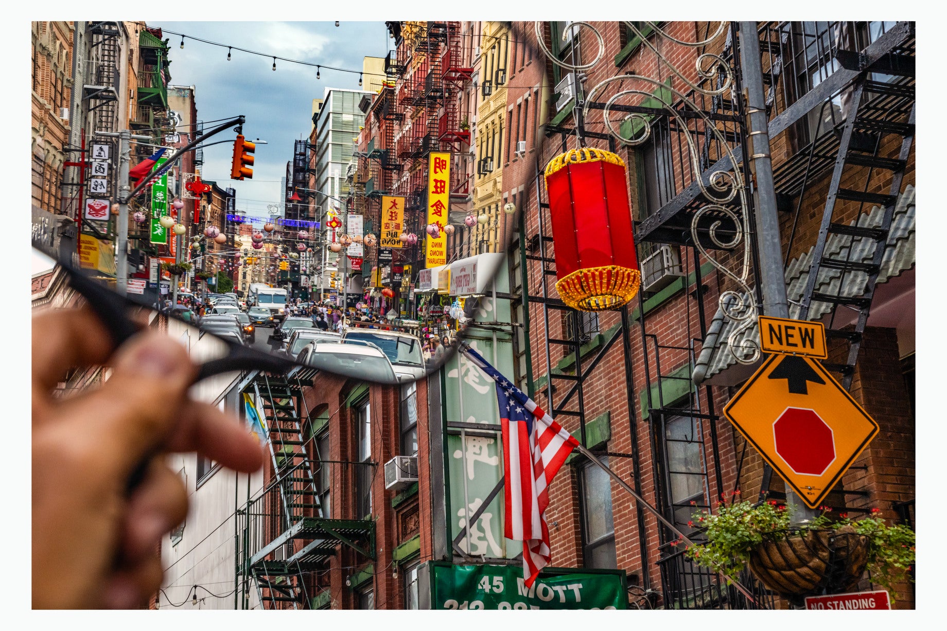 Using a hand held mirror in locations around New York - here Mott Street in Manhattan's Chinatown - I invite distant buildings, structures or other nearby scenes into the main photo to create a viewing experience that requires a second look. My goal is to visually loosen up the obvious, to create images that surprise me as much as I hope they will surprise and intrigue the viewer.