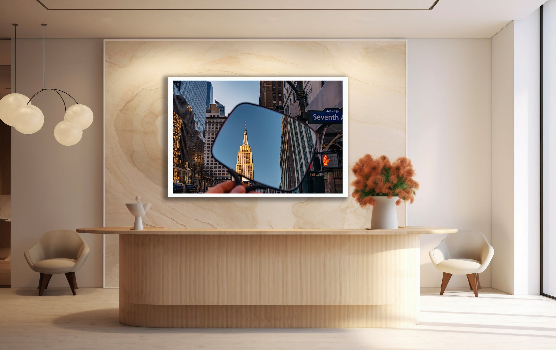 Using a hand held mirror in locations around New York - here the The Empire State Building - I invite distant buildings, structures or other nearby scenes into the main photo to create a viewing experience that requires a second look. My goal is to visually loosen up the obvious, to create images that surprise me as much as I hope they will surprise and intrigue the viewer.