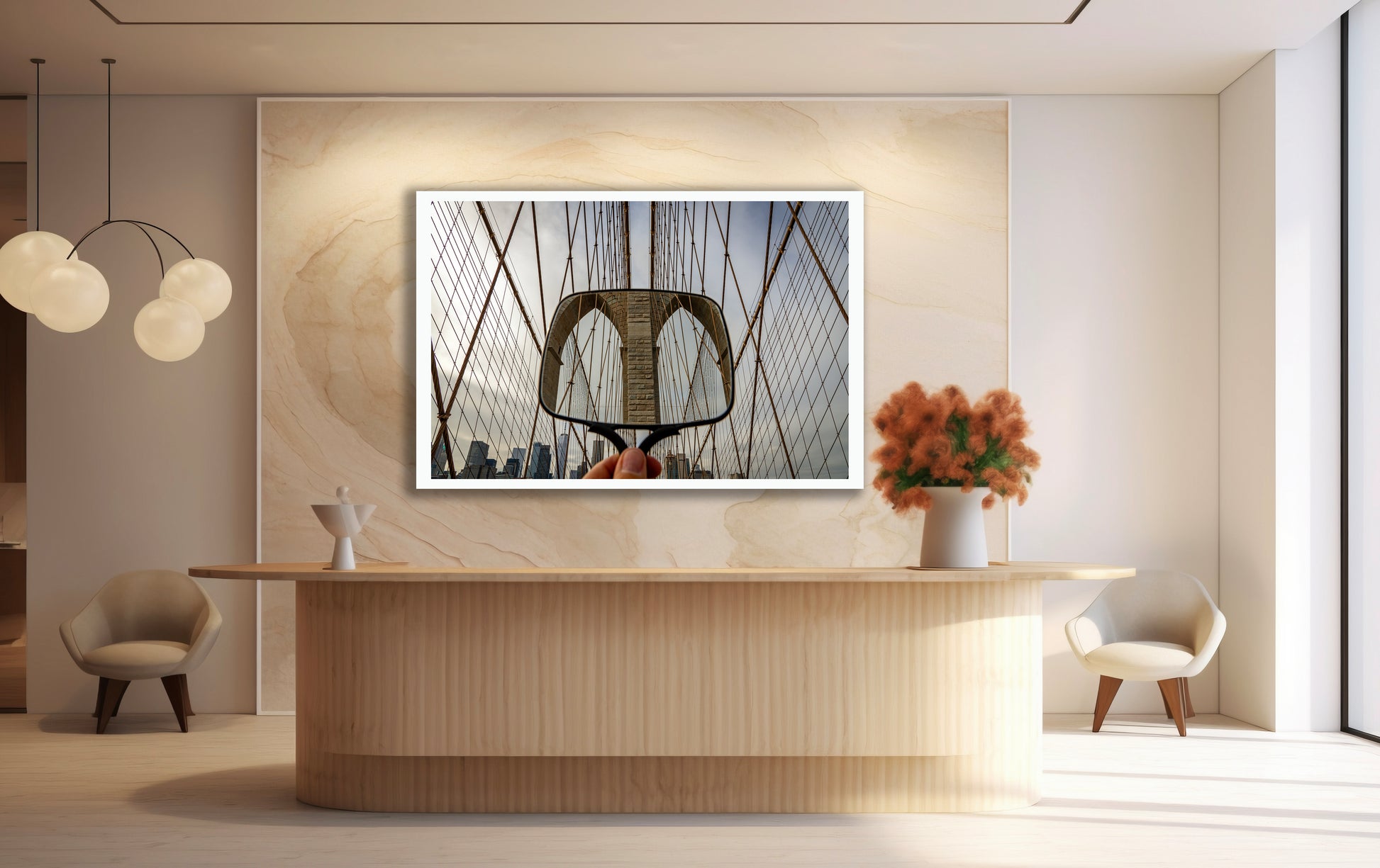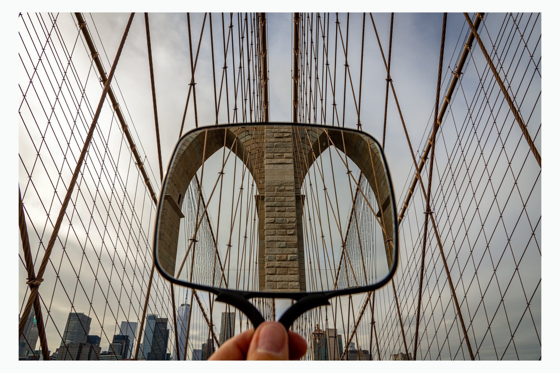 Using a hand held mirror in locations around New York - here Brooklyn Bridge - I invite distant buildings, structures or other nearby scenes into the main photo to create a viewing experience that requires a second look. My goal is to visually loosen up the obvious, to create images that surprise me as much as I hope they will surprise and intrigue the viewer.